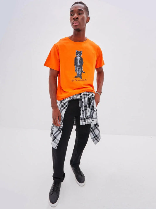 Set: women's orange t-shirt with rocker cat print and black tulle maxi skirt
