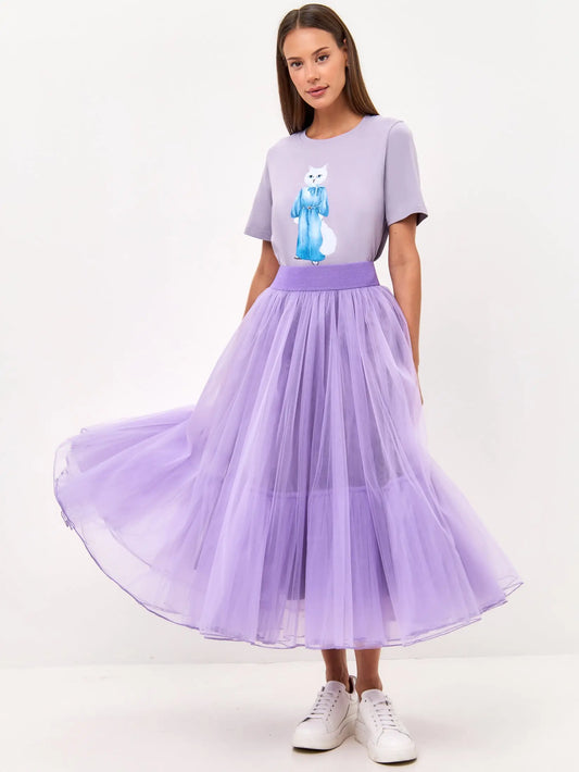 Lila kurzes, weit geschnittenes T-Shirt im Sportstil mit Katze