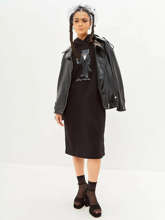 Schwarzes bedrucktes Hoodie-Kleid Dandy-Katze