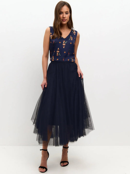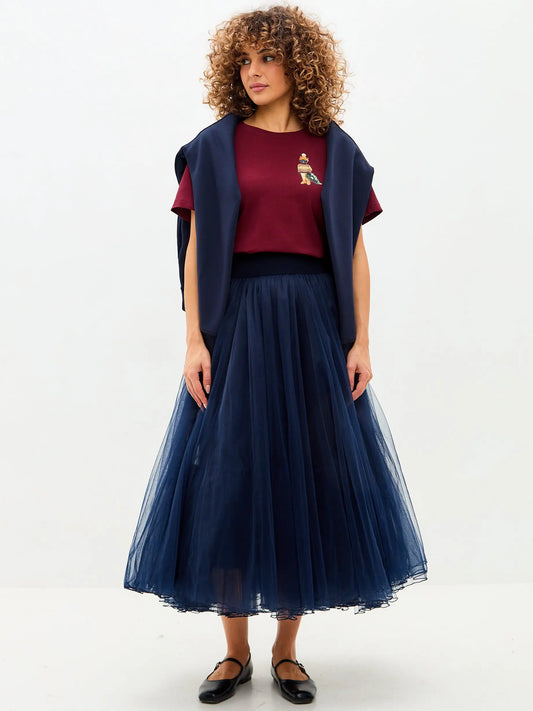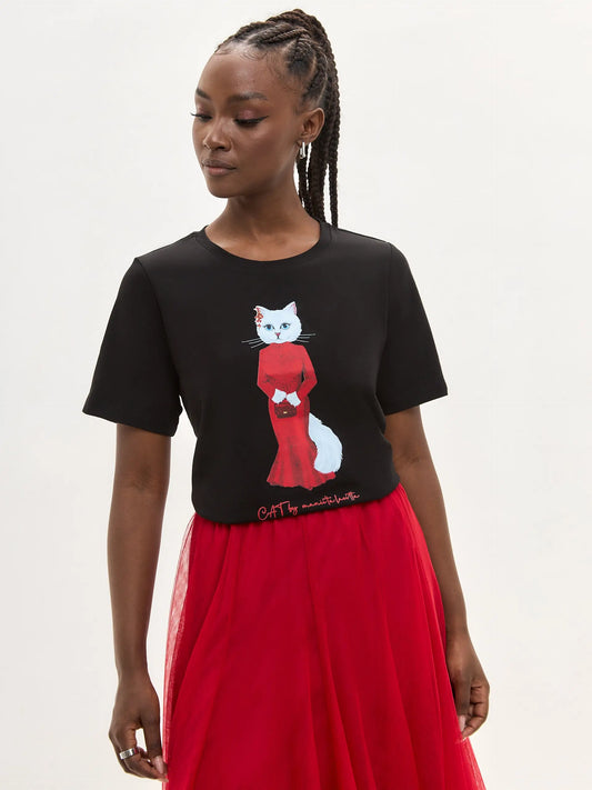 Eleganz-Set: Damen-Schwarzes T-Shirt mit weißer Katze und schwarzem Tüll-Maxirock