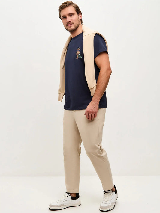 Grundset: Weiße Damen-T-Shirt mit Dandy-Katzen-Print und schwarze weite Jogginghose
