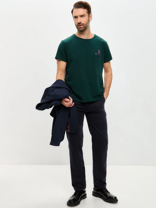 Neujahrsset: grünes Damen-T-Shirt mit Neujahrskatze und rote Culottes.