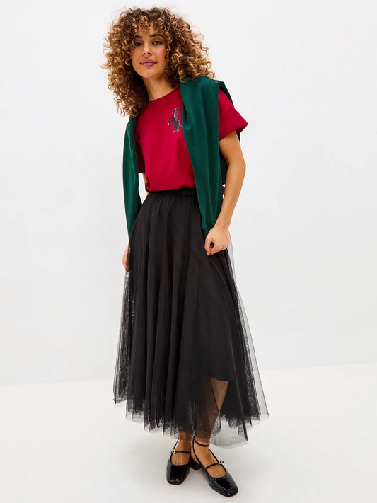 Weihnachtliches Set: Rotes Damen-T-Shirt mit einer schwarzen Katze und einem schwarzen Tüll-Maxirock