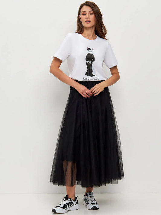 Grundset: Damenweißes T-Shirt mit einem eleganten Katzenmotiv und schwarzem Tüll-Maxirock