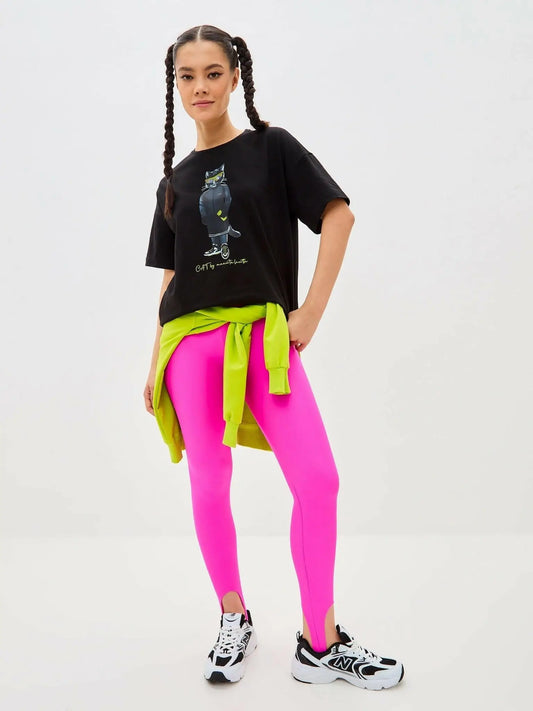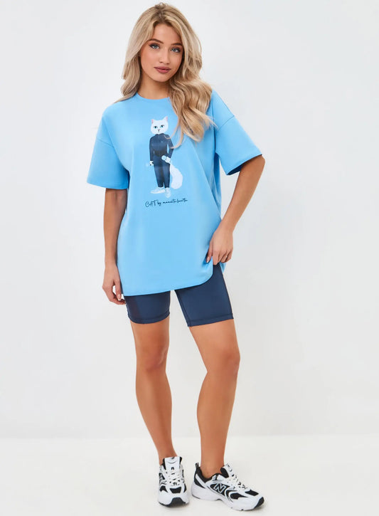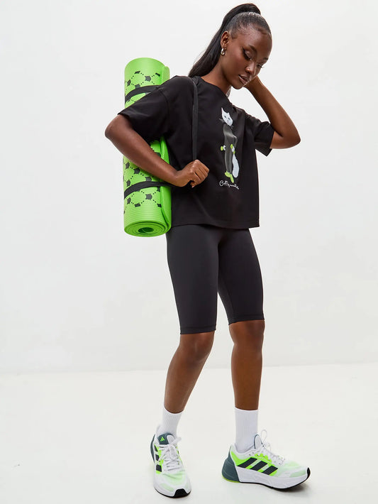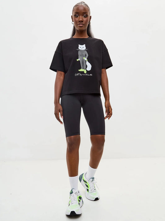 Schwarzes, kurzes, oversize Sport-T-Shirt mit Katze
