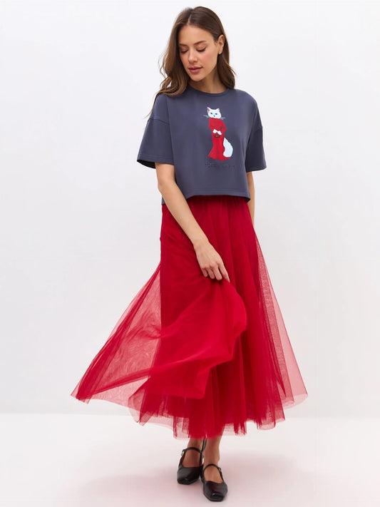 Conjunto: camiseta para mujer con un gato blanco y una falda de tul roja
