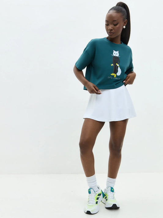 Camiseta deportiva de color azul, de tamaño corto y tamaño holgado, con felpa de gato