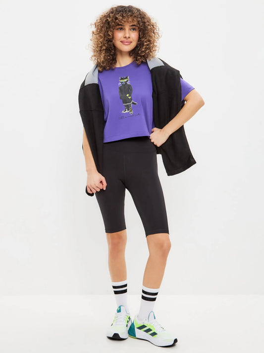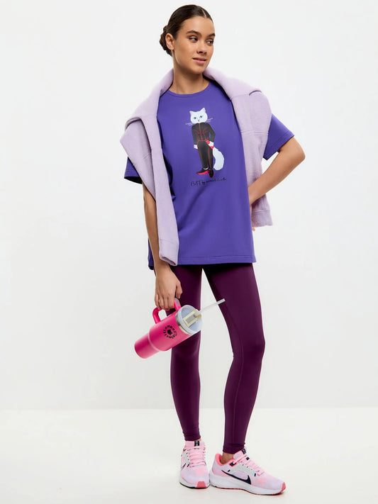 Camisa deportiva corta y oversize de color púrpura con gato