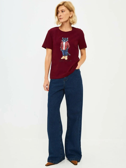 Conjunto: camiseta de color burdeos para mujer con impresión de gato navideño y vaqueros beige
