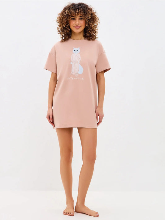 Pijama de camiseta beige de gran tamaño con gato